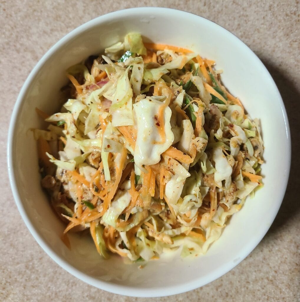Add the salad dressing to the veggies (cabbage, cucumber, carrots and pickled onions) and then add the seared chicken and combine properly.