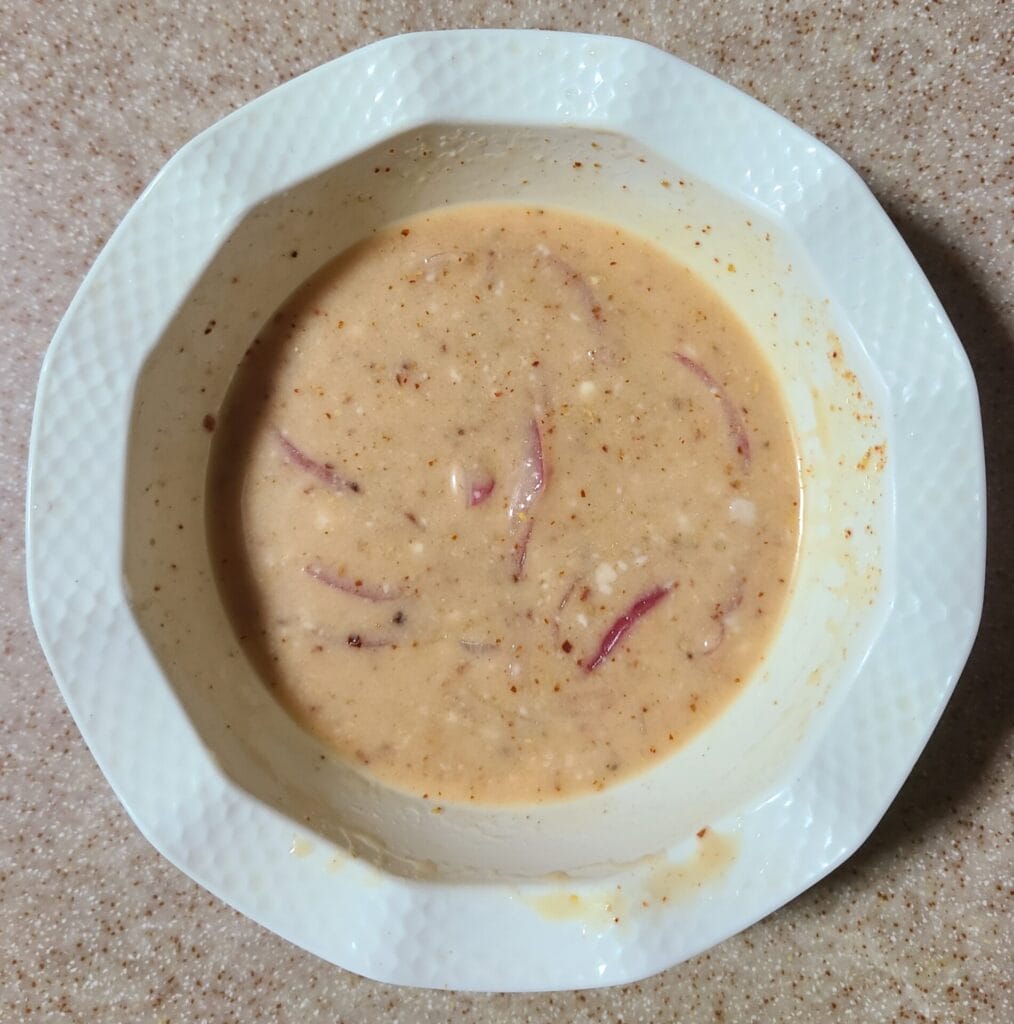 In a bowl, mix mayonnaise, chili pepper, salt, honey, onion pickle brine, and finely chopped parsley(optional).