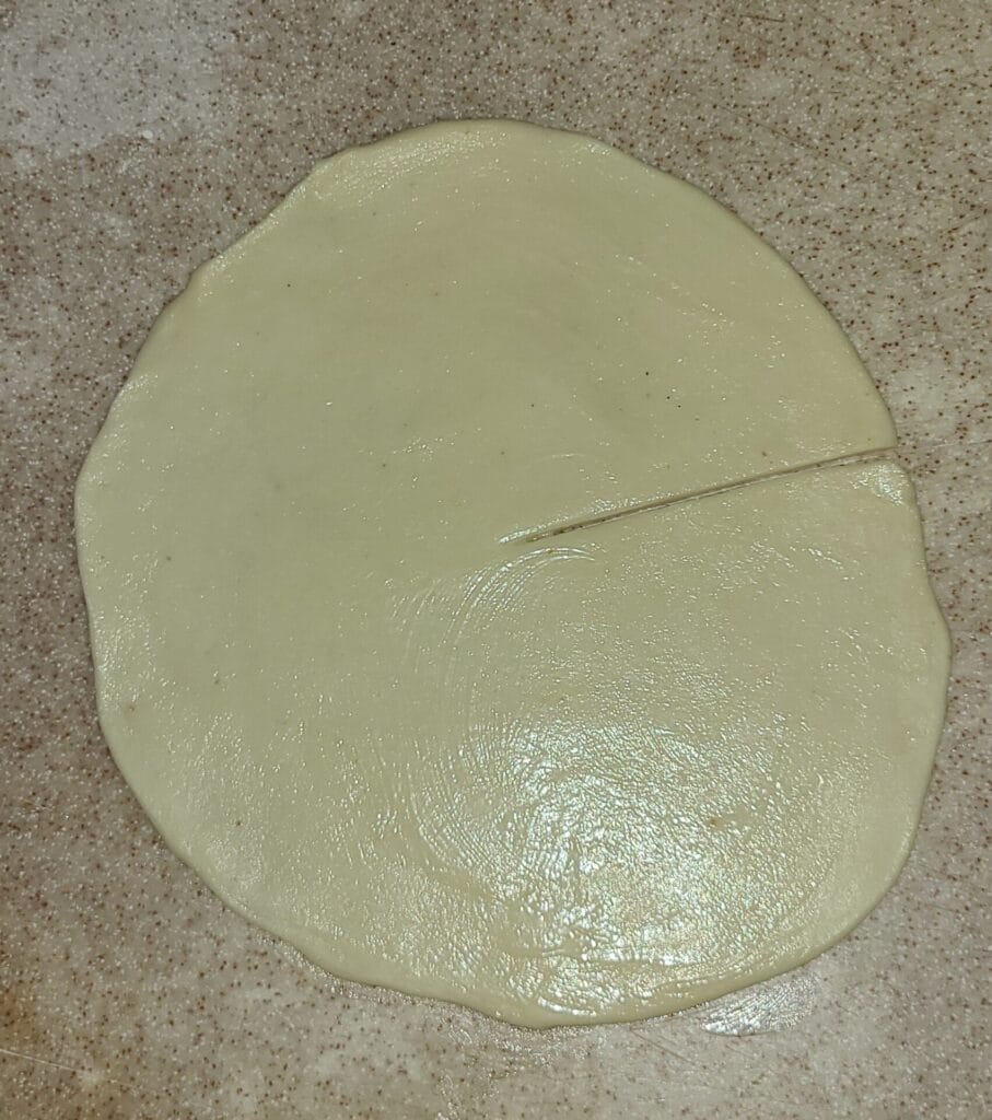 Bring it out of the refrigerator, sprinkle some flour on work table and roll it out to 25cm and set aside.