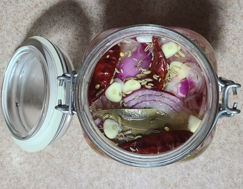 Stuff all the red onions, garlic, cayenne pepper, bay leaves and fennel seed in the jar of your choice. A bowl works too but a jar is easier to store in the fridge.
